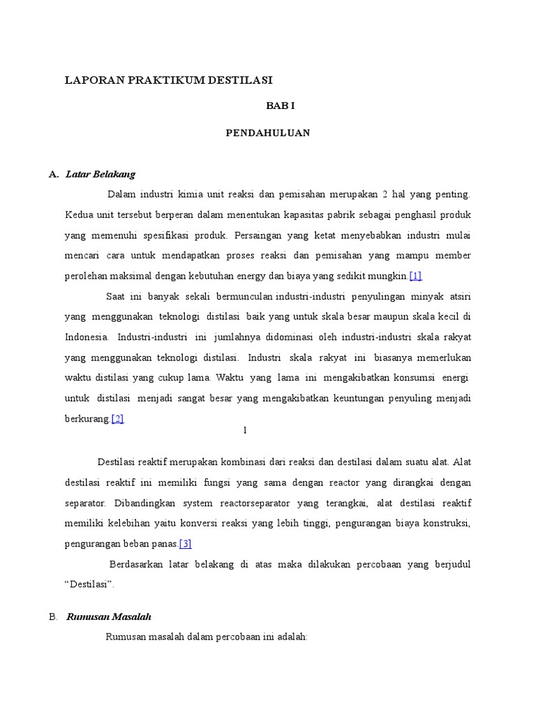 View laporan praktikum destilasi.docx from engr 210 at thomas jefferson university. La ashar, s.pd laboratorium pengembangan unit kimia fakultas keguruan dan ilmu pendidikan universitas haluoleo kendari 2013 Definisi minyak atsiri dan destilasi Laporan praktikum kimia organik ii destilasi uap rabu, 18 april 2014 disusun oleh: Kajian teori distilasi atau penyulingan adalah suatu metode pemisahan bahan kimia berdasarkan perbedaan kecepatan atau kemudahan menguap (volatilitas) bahan.
