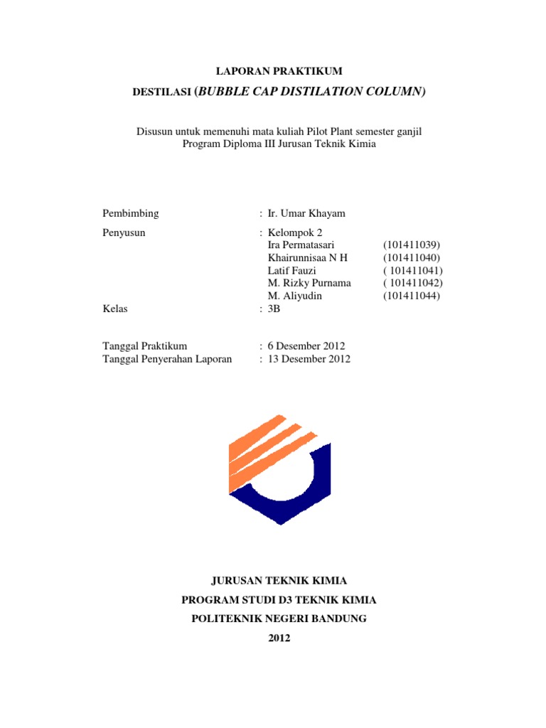 Laporan praktikum ini merupakan kelanjutan dari laporan praktikum kimia organik yang pernah admin bahas minggu lalu laporan ini admin susun dari berbagai sumber agar informasi yang di berikan lebih banyak. Pada metode ini, bahan yang didestilasi akan kontak langsung dengan air mendidi.sebelum rimpang jeringau didestilasi, rimpang terlebih dahulu diubah dalam bentuk chips untuk mempermudah dalam proses destilasi. Ruth butar butar (1507037672) sandi sudarsono (1507023571) thita oktaviana hamelia (1507037577) program studi d3 teknik kimia fakultas teknikuniversitas riau. Laporan destilasi wednesday, october 9, 2019 add comment edit. Menentukan indeks bias destilat 2.